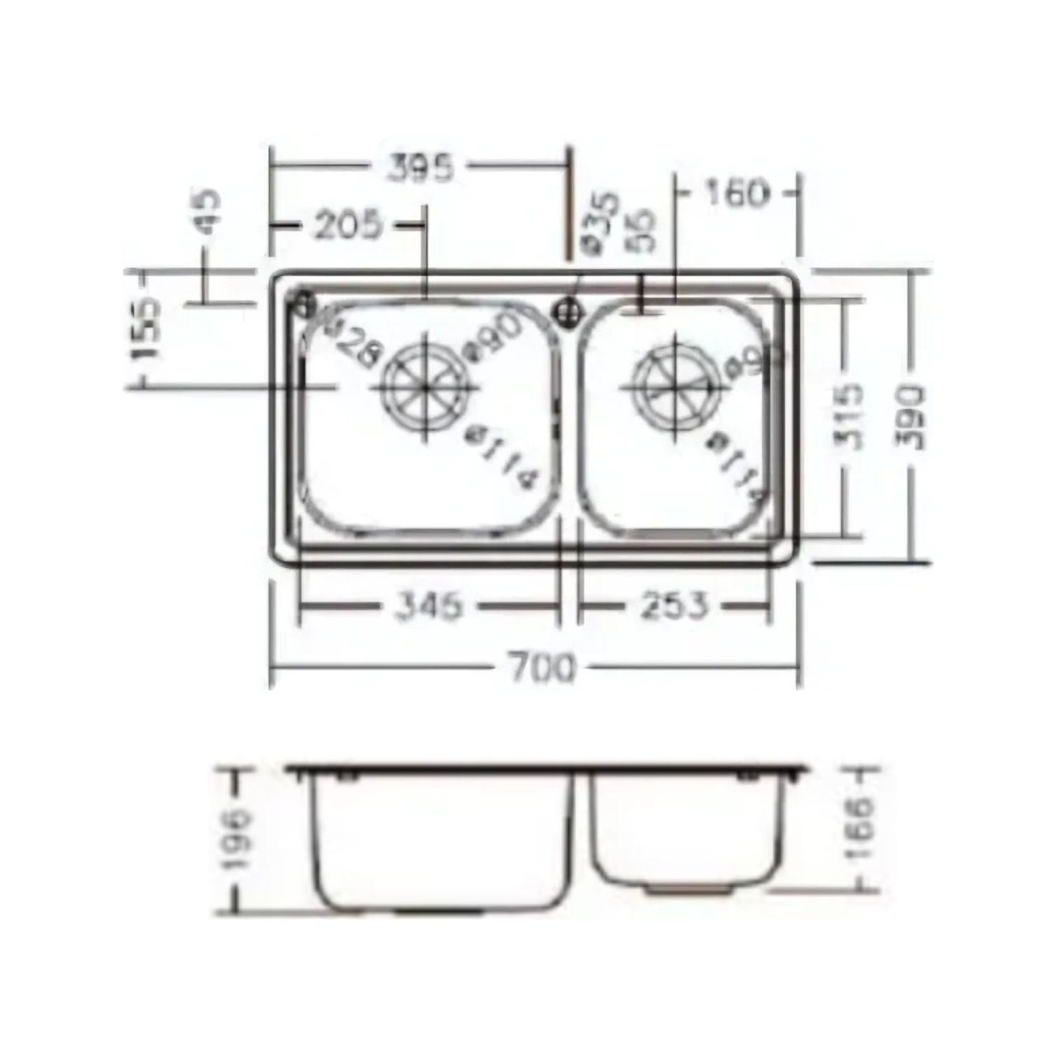 Materials:304 Stainless Steel Brushed Dimension (L x W x H): 700 x 390 x 196mm Opening Size: 670 x 360 x R20 mm (Hole) Configuration:Contains: Drain parts