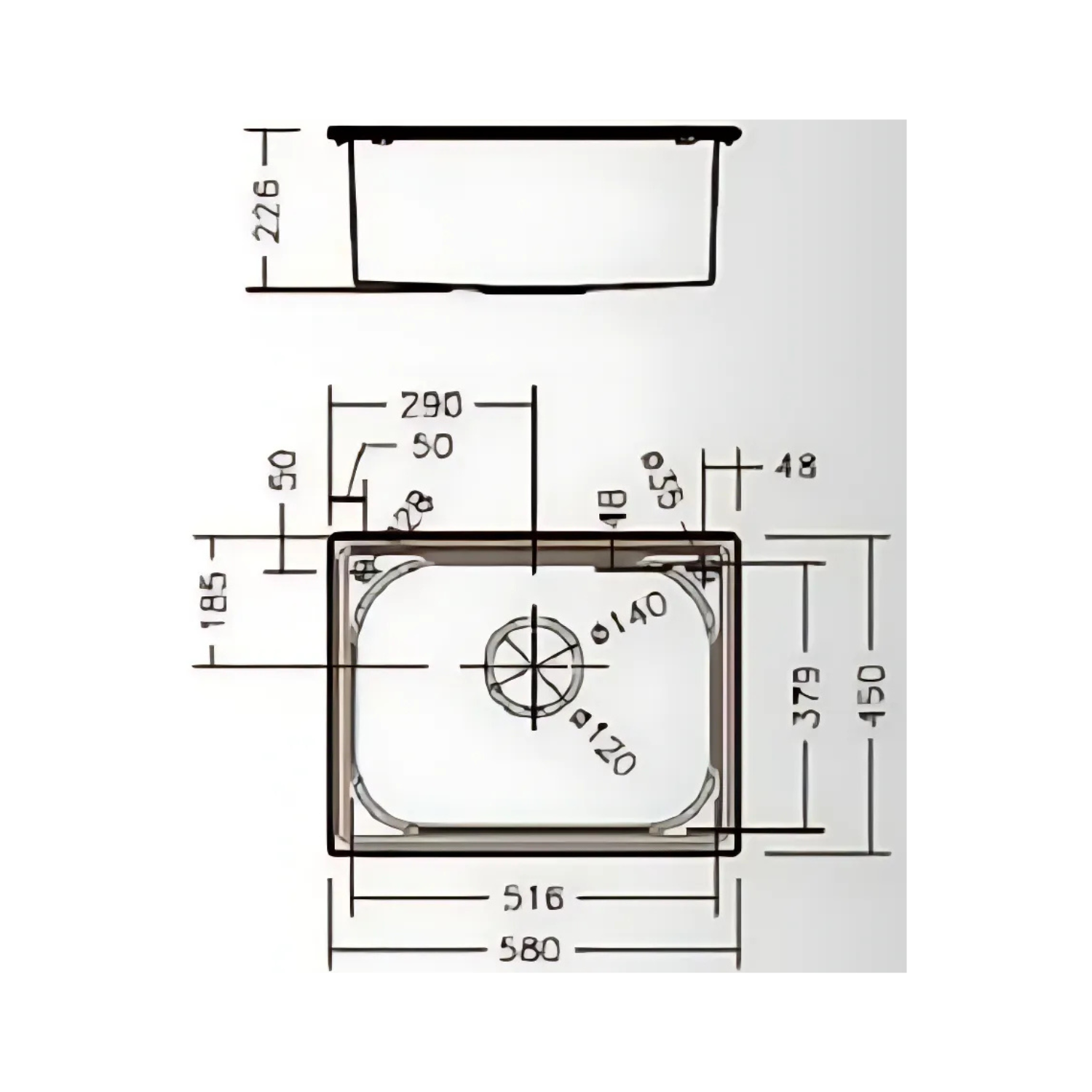 Materials:304 Stainless Steel Brushed Dimension (L x W x H): 580 x 450 x 226mm Opening Size: 550 x 420 x R20 mm (Hole) Configuration:Contains: Drain parts